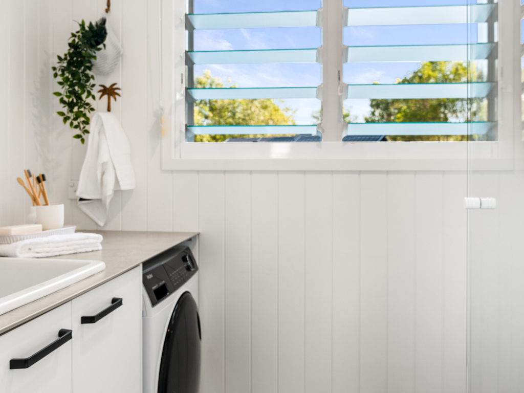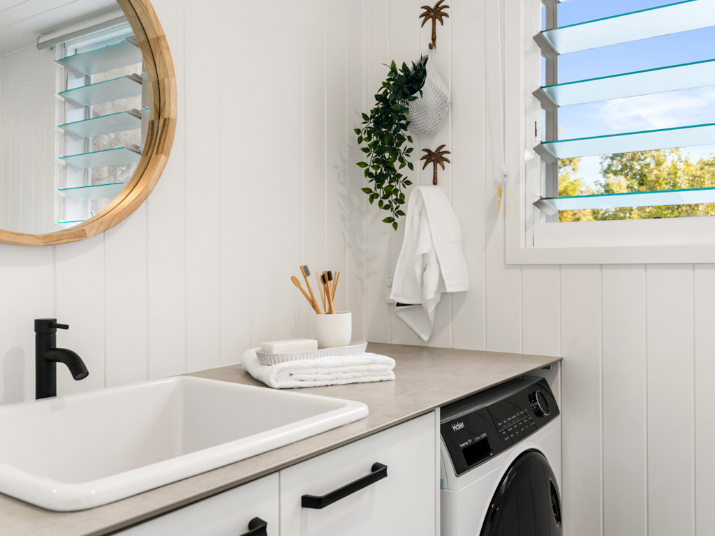 The bathroom is well appointed with shower, toilet, vanity and under bench space for a washing machine.